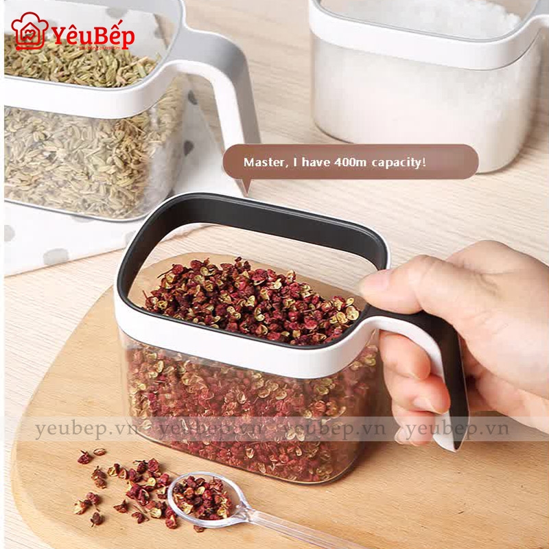Phần hũ đựng: thiết kế trong suốt giúp dễ phân loại gia vị. Bên cạnh đó, tay cầm chắc chắn, xinh xắn cũng góp phần tăng sự thuận tiện khi sử dụng. Kích thước hũ đựng khá lớn, giúp bạn chứa được nhiều gia vị mà không cần phải thay thường xuyên.