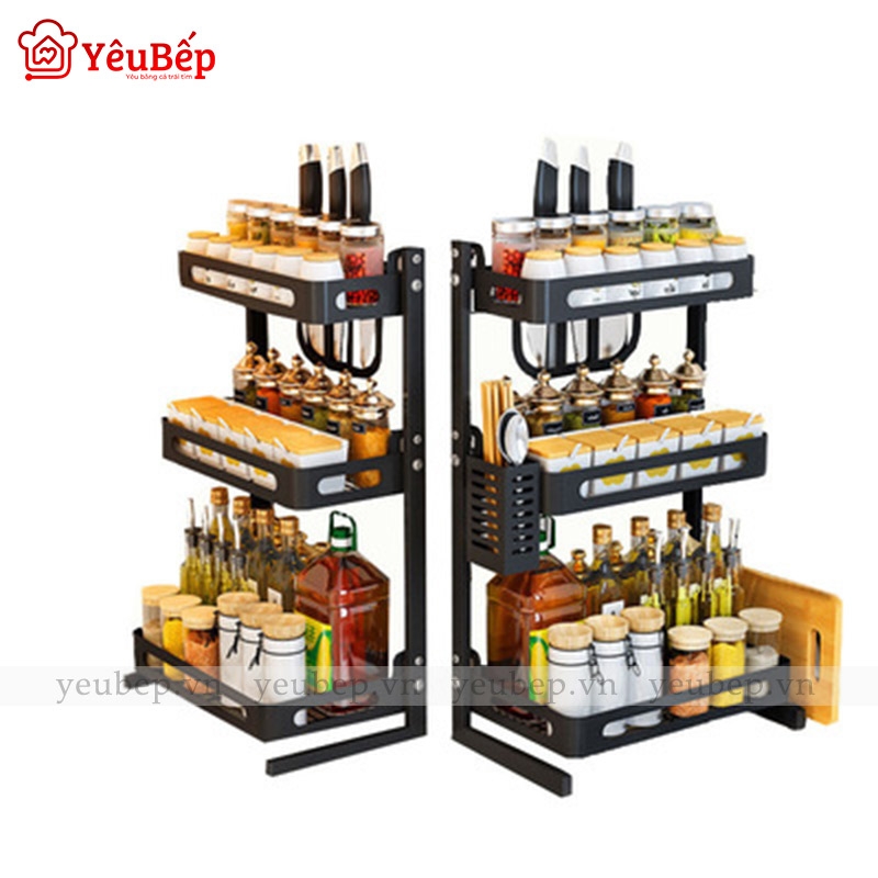 Hơn nữa, thiết kế này giúp bạn có thể đặt kệ gia vị 3 tầng này trong góc bếp. Giúp bạn tiết kiệm được tối đa không gian sử dụng và tận dụng vị trí góc bếp ít được sử dụng.