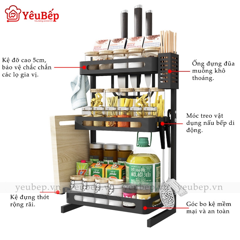Đặc biệt, ngoài 3 tầng để đựng các loại gia vị, mẫu kệ này còn có nhiều phụ kiện đi kèm có thể để được: thớt, dao, ống đựng đũa muỗng, móc treo khăn, móc treo dụng cụ nấu ăn, dụng cụ gọt rau củ,... Tất cả đều được cố định chắc chắn bằng các móc treo và đinh ốc liên kết.