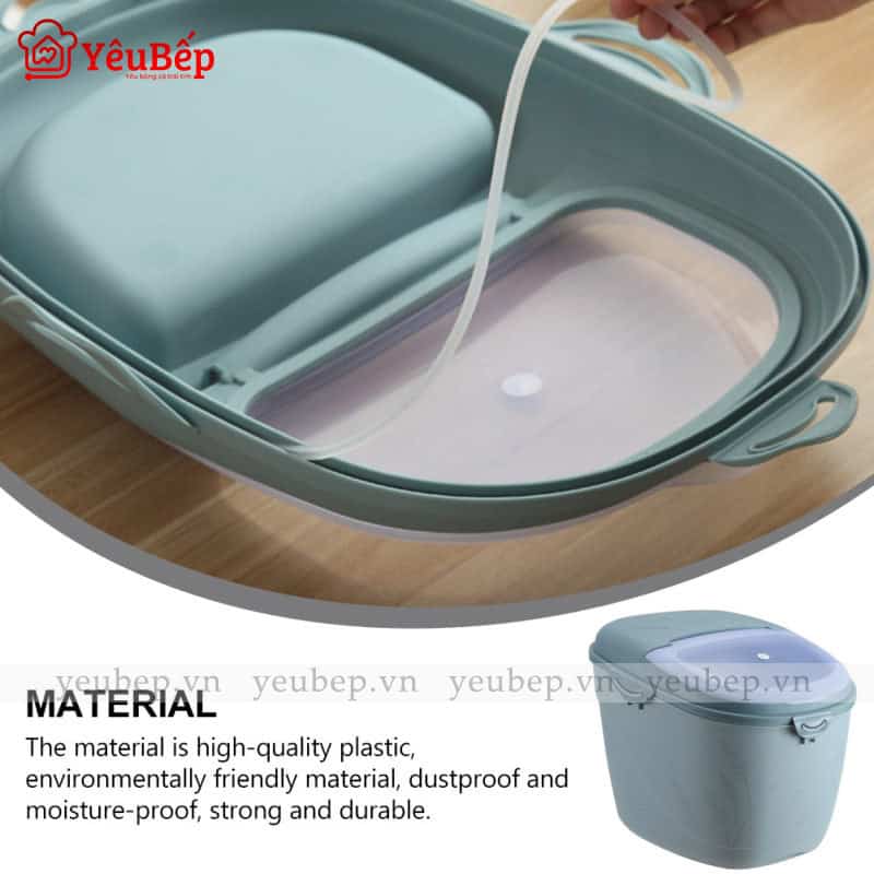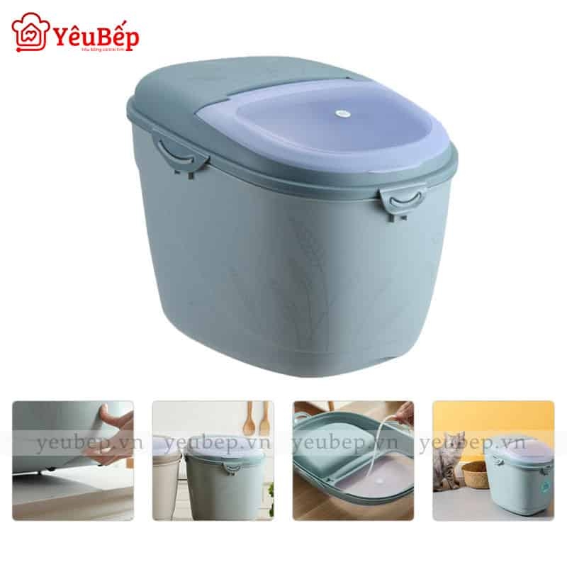 Bên cạnh đó, thùng đựng gạo còn trang bị khóa mở chắc chắn cùng với dây silicon vòng quanh nắp đậy. Nhằm đảm bảo không có nước, bụi bẩn, hay các tác động xung quanh làm ảnh hưởng đến gạo bên trong.