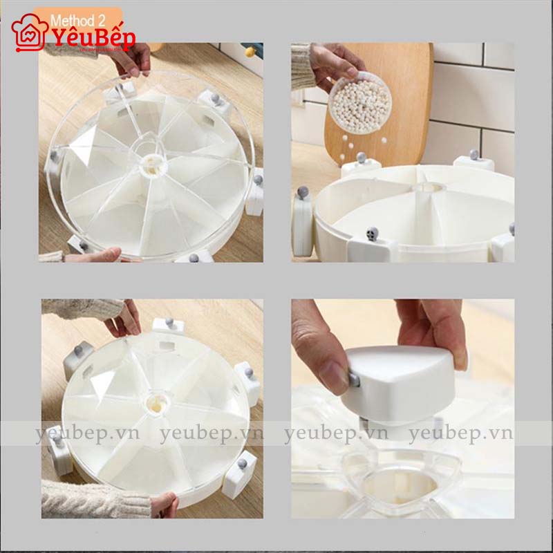 Bộ sản phẩm bao gồm 1 thùng 6 ngăn, 1 cốc đựng và phễu giúp bạn dễ dàng lấy thực phẩm ra bên ngoài và có thể thêm bớt thực phẩm một cách dễ dàng